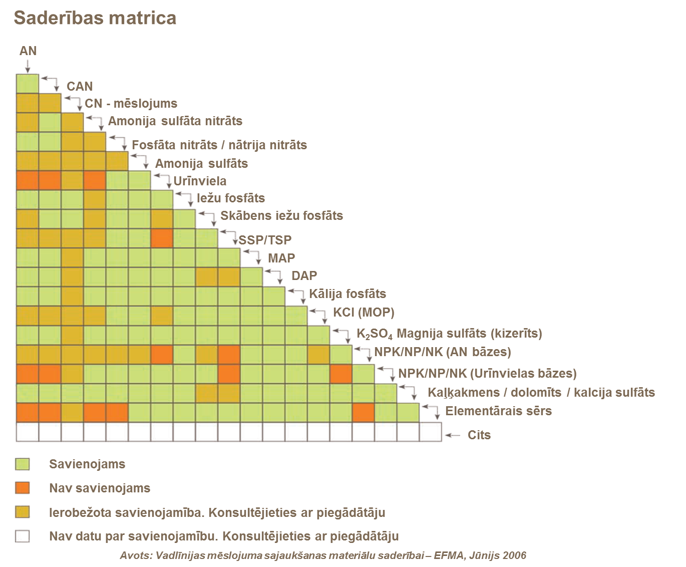 Vielu saderība galvenokārt ir svarīga dažādu mēslošanas līdzekļu sajaukšanas gadījumā, kad var rasties savstarpējs piesārņojums un citas drošības un / vai kvalitātes problēmas; piemēram, salipšana, efekta pavājināšanās, putekļi, bet amonija nitrāta gadījumā - pretestības zudums pret termālo ciklēšanu.