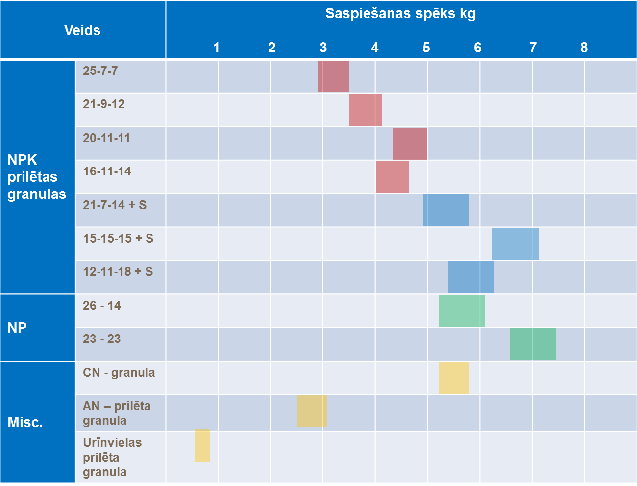 Mēslojuma daļiņu saspiešanas spēks ievērojami atšķiras atkarībā no produkta ķīmiskā sastāva. Dažādiem mēslojuma veidiem izmērītais saspiešanas spēks ir attēlots tabulā.