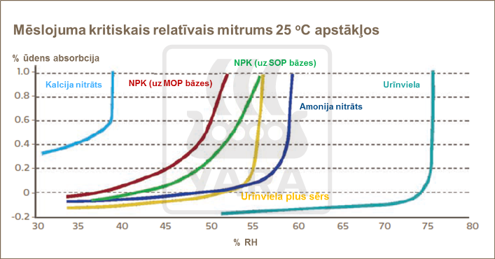 Ūdens absorbcijai ir negatīva ietekme uz lielāko daļu mēslojuma produktu. Daļiņas var kļūt lipīgas un sākt sadalīties.