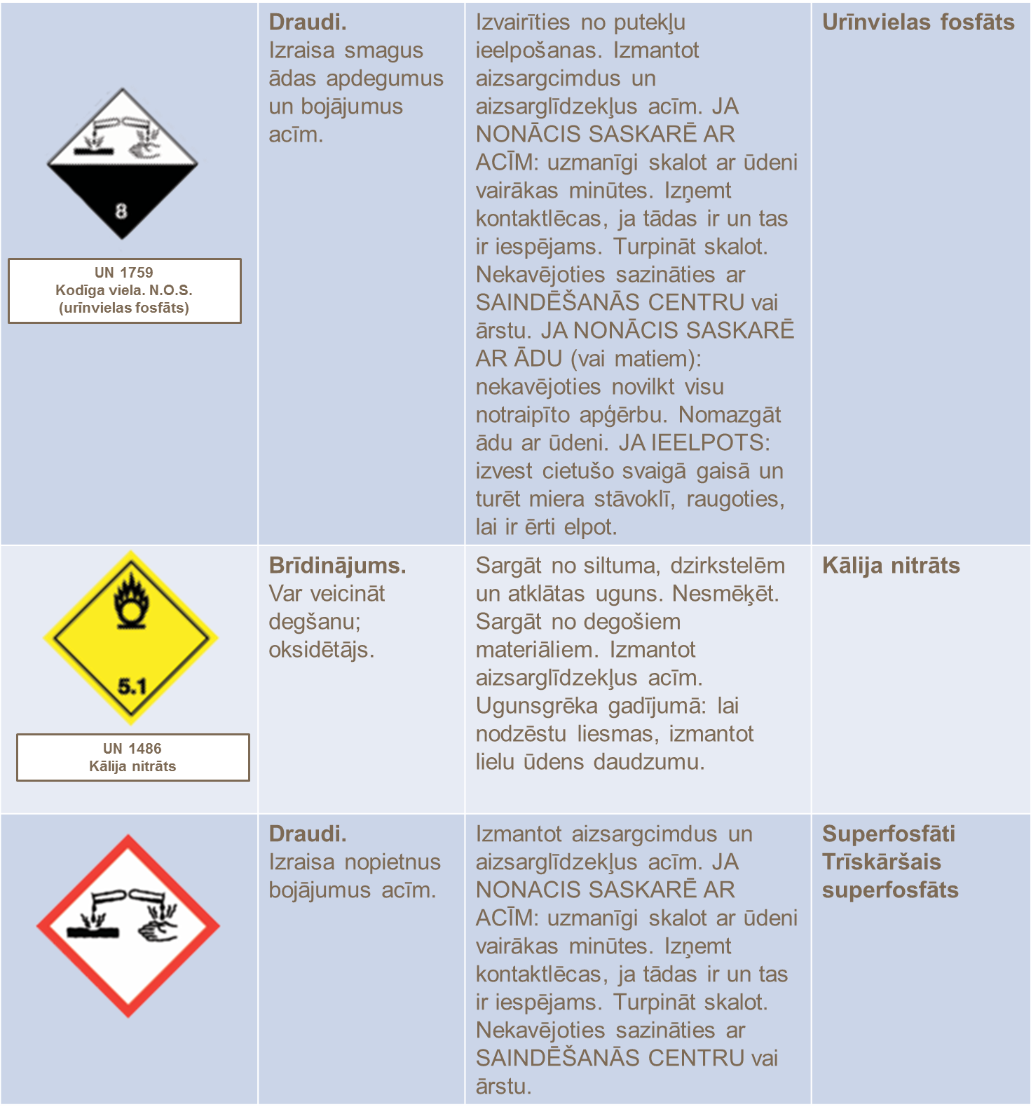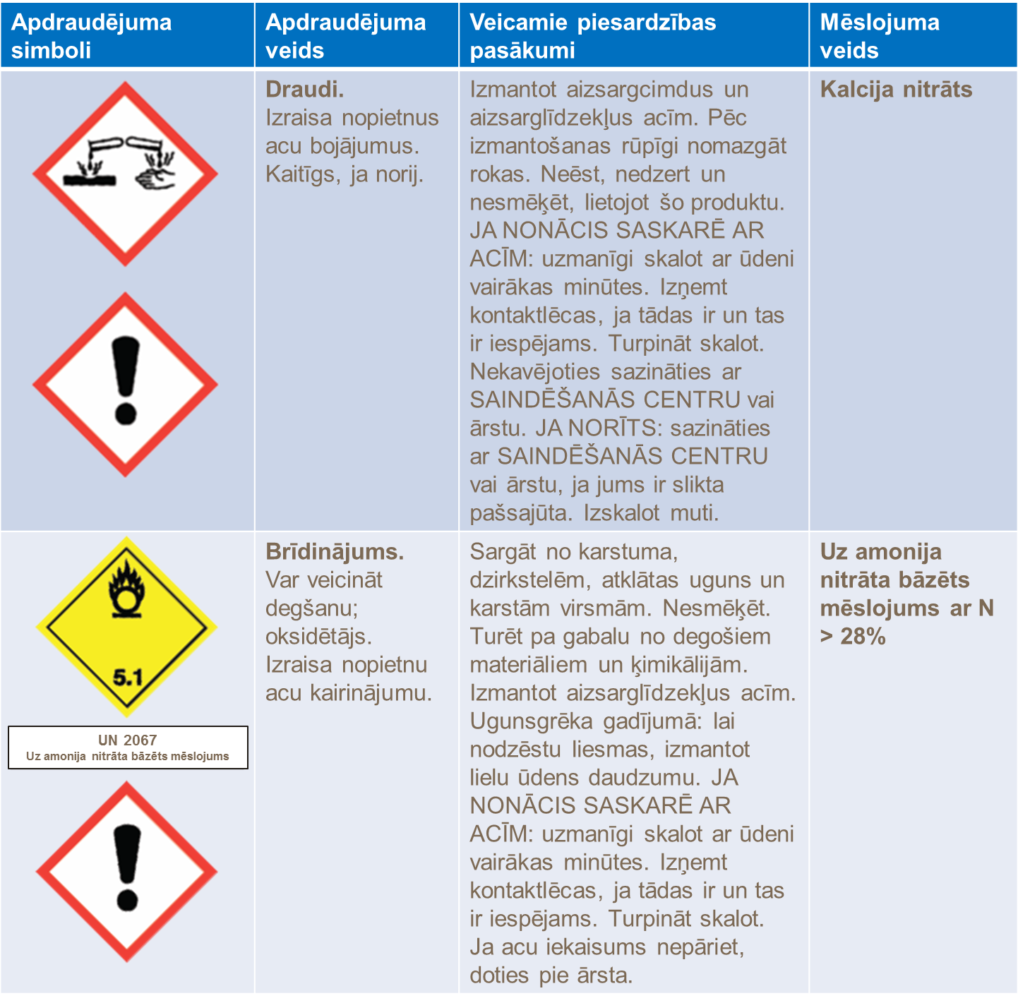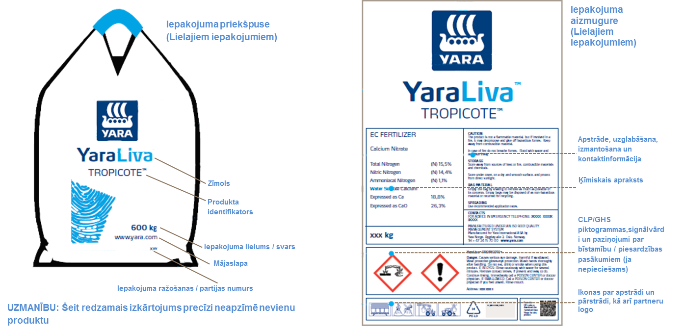 Uz mēslojuma iepakojuma etiķetes Jūs atradīsiet svarīgu informāciju par produkta transportēšanu, uzglabāšanu un izmantošanu. Produkta klasifikācija un marķēšana notiek saskaņā ar katras konkrētās valsts tiesību aktiem un ES regulējumu, bet transporta klasifikācija ir atbilstoša ANO Bīstamo kravu pārvadājumu prasībām – regulas modelim (TDG). Produkta ķīmiskais sastāvs ir norādīts uz iepakojuma, un tas ir saskaņā ar katras valsts nacionālo regulējumu. Vietējie pārdošanas biroji var sniegt papildu informāciju un palīdzību.